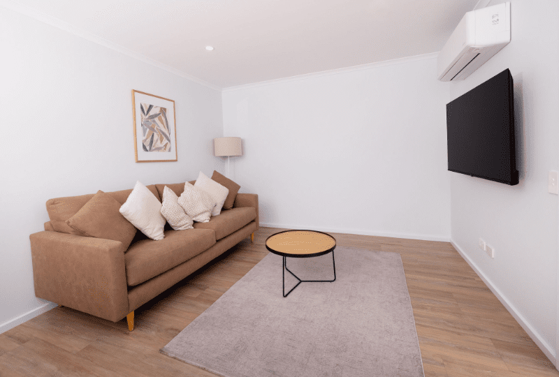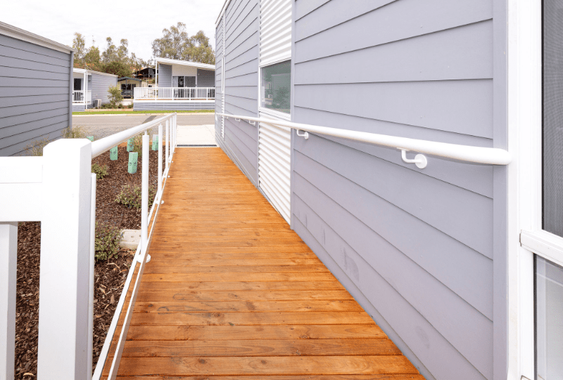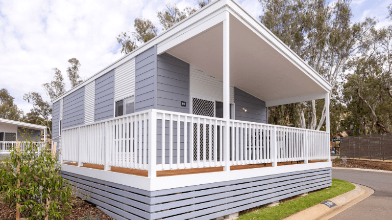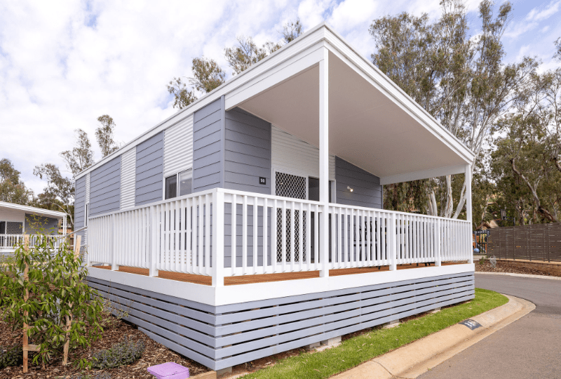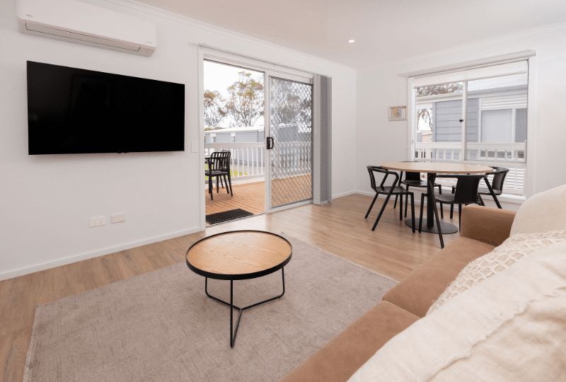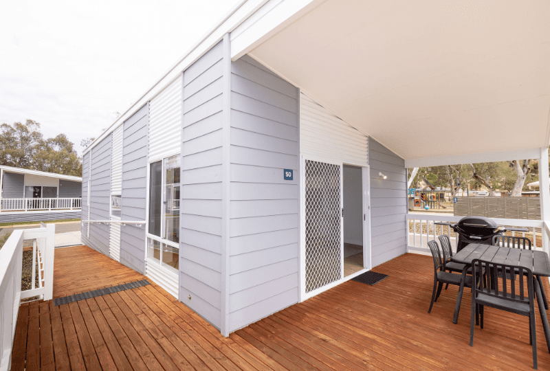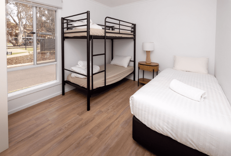 Perfect for up to five guests, our Two-Bedroom Accessible Superior Cabin is the ideal choice for your next getaway on the Murray River! This spacious, open-plan cabin features a king bed in the main bedroom and a single bed with a set of bunk beds in the second bedroom. Enjoy the fully equipped kitchen which includes a cooktop, microwave, full-sized fridge, and all the necessary crockery, cutlery, and utensils. Take advantage of the Weber BBQ and outdoor dining area for relaxed meals, then unwind with the TV in the living space while enjoying high speed internet and streaming services. The cabin’s bathroom offers a shower, toilet and vanity. The cabin is also air conditioned to ensure you have a comfortable stay. We offer select dog-friendly options—just let us know if you plan to bring a dog as additional charges may apply.