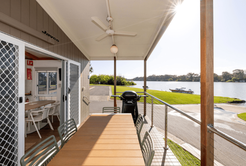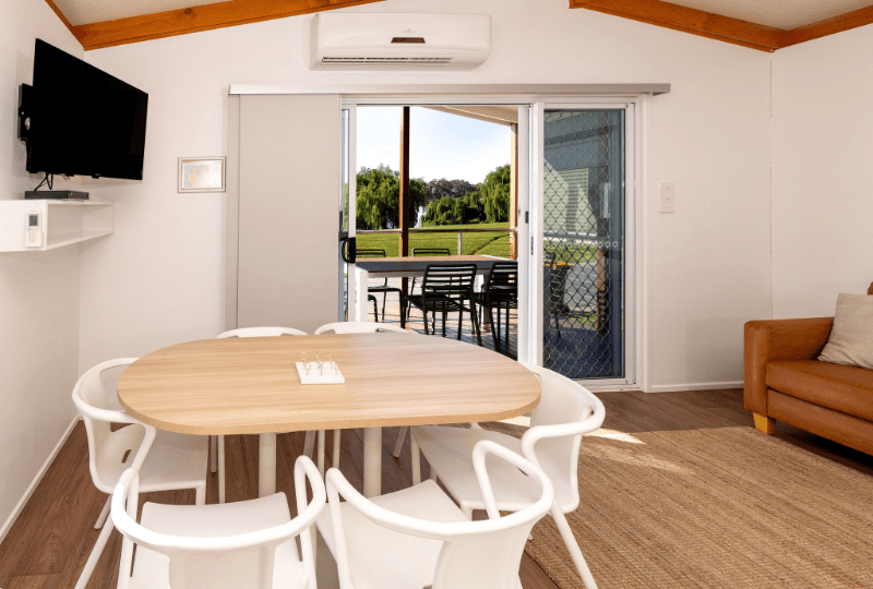 Perfect for up to seven guests, our Three-Bedroom Riverview Villa is the ideal choice for your next family or group getaway on the Murray River! In this open-plan villa, you’ll find a queen bed in the main bedroom, two single beds in the second bedroom (which can be arranged as a king bed), and one set of bunk beds with a single bed in the third bedroom. The self-contained kitchen is equipped with a dishwasher, fridge, microwave, stovetop, and plenty of crockery and cutlery. Enjoy a separate dining area and a cozy living space with a TV. A Weber BBQ is also provided, perfect for relaxed outdoor dining. The bathroom includes a shower, toilet, and vanity, and the villa is air-conditioned to keep you comfortable throughout your stay. We offer dog-friendly options—please let us know if you plan to bring a dog, as additional charges may apply. *Please note that the villa’s surroundings may differ from the images shown.